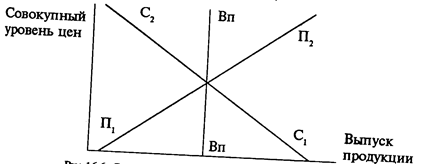 Тип cмешaннoгo управление национальным хозяйством имеет следующие специфические черты. Во-первых, новый регулятор органически соединяет устойчивость государственного управления, необходимую для удовлетворения общественных потребностей (нужд нерыночного сектора и социальной сферы) и гибкость рыночного саморегулирования, что требуется в особенности для удовлетворения многообразных и быстро меняющихся личных запросов. Во-вторых, только тип смешанного управления позволяет оптимально сочетать высшие макроэкономические цели: эффективность хозяйствования, социальную справедливость и стабильность экономического роста. В-третьих, новый регулятор способен сбалансировать совокупный спрос и совокупное предложение. Как можно достичь макроэкономического равновесия, наглядно изображается на рис. 16.6, где графически представлены совокупный спрос (С1 – С2), совокупное предложение (П1 – П2) и потенциальный выпуск продукции (Вп).