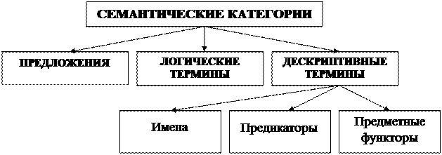 Все выражения, являющиеся знаками, в зависимости от типов их предметных значений могут быть разбиты на классы, называемые семантическими категориями. Семантическая категория – это класс выражений с однотипными предметными значениями, при этом включающий все выражения с предметным значением данного типа. Такими классами являются имена, предикаторы, предметные функторы, логические термины, повествовательные предложения. Имена – слова и словосочетания, являющиеся знаками предметов. Предикаторы – выражения языка (слова и словосочетания), предметными значениями которых являются свойства (одноместные предикаторы) и отношения (многоместные предикаторы). Свойствами в современной логике называют характеристики отдельных предметов («белый», «странный», «иметь спинку», «ходить» и т.п.). Отношения – это связь между двумя и более предметами («находиться между», «быть братом», «быть больше», «знать лучше, чем» и т.п.). Таким образом, отношения представляют собой характеристики не отдельных предметов, а некоторых систем предметов. Наличие или отсутствие у какого-либо предмета свойства или отношения к другим предметам называется признаком. Признаки – это любые возможные характеристики предмета, все, что можно высказать о предмете. Предметные функторы – это знаки так называемых предметных функций. Наряду с математическими функциями «синус», «логарифм», «умножение» и т.п. сюда относятся такие особые характеристики предметов, как скорость, плотность, возраст, пол, профессия, агрегатное состояние, место жительства и др. Иногда их называют предметно-функциональными характеристиками. Логические термины (логические константы) – это знаки логических отношений «и», «или», «если…, то…», «неверно, что» и операций «всякий», «существует» («некоторые»), «тот…, который…». Знаки первых четырех категорий (имена, предикаторы, предметные функторы и логические термины) используются в составе предложений. При этом, в отличие от логических терминов, имена, предикаторы и предметные функторы называются дескриптивными (описательными) терминами (рис. 1).