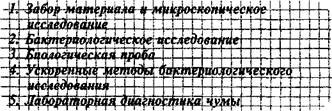 1. Чума является чрезвычайно контагиозной, поэтому взятие материала от больного (особенно легочной формы) производится с соблюдением мер предосторожности. Работа в очаге проводится в полном противочумном костюме. В лабораторию могут быть доставлены следующие материалы: • содержимое бубона (легочная форма чумы); • отделяемые язвы или пунктет из карбункула (кожная форма чумы); • материал из зева, взятый тампоном, и мокрота (легочная форма чумы); • секционный материал (кусочки органов трупа, кровь); • живые грызуны; • трупы грызунов; • блохи грызунов; • вода; • пищевые продукты. Материал необходимо брать до назначения лечения. Значение микробиологического диагноза огромно, особенно для выявления первых случаев чумы. Предварительный диагноз устанавливают на основании микроскопического исследования материала, окончательный — на основании выделения и идентификации культуры. Микроскопическое исследование: мазки фиксируют погружением полностью в жидкость Инпифорова на 20 мин. Окраска по Грому обязательна во всех случаях. Одновременно окрашивают мазок метиленовым синим Леффлера, так как этот метод лучше выявляет биполярность. 2. Бактериологическое исследование: посевы исследуемого мате Когда чистая культура выделена путем прямого посева, она подлежит идентификации на основании следующих данных: • внешний вид колонии на агаре; • характерный рост на бульоне; • типичная морфология микробов в мазках и отрицательная окраска по Граму; • типичная патологоанатомическая у лабораторных животных при заражении их чистой культурой; • агглютинация со специфической сывороткой; • отношение к специфическому бактериофагу. Исследование ферментативных свойств, подвижности и т. п. производят лишь в специальных случаях для дифференциального диагноза с родственными видами бактерий. Проба с фагом осуществляется на твердых средах путем нанесения капли фага на свежий посев культуры и на жидких - путем добавления в бульонную культуру фага в количестве Vio объема культуры. Окончательное заключение делают на основании изучения комплекса признаков исследуемой культуры. При этом не следует забывать о явлении изменчивости. 3. Биологическая проба обязательна при исследовании; наиболее В зависимости от способа заражения и степени чувствительности к возбудителю животные погибают от чумы на 3—9-й день после инфицирования, изменения во внутренних органах в виде геморрагического воспаления, кровоизлияния: в мазках-отпечатках из органов — множество чумных микроорганизмов; посевы инфицированных органов и крови дают обильный рост возбудителя. 4. Ускоренные методы бактериологического исследования. Метод ускоренного обнаружения возбудителя чумы с помощью бактериофага, внесенного в исследуемый материал, используют для исследования объектов, имеющих основное практическое значение: материал от больного, от трупа, из внешней среды. Исследуемый материал наносят на 3 агаровые пластины с гемо-лизированной кровью и генциановым фиолетовым. На первой и второй агаровой пластине в исследуемый материал сразу же вносят чумной бактериофаг (разведенный в 10 раз). На третью чашку бактериофаг не добавляют (контроль). Результаты начинают читать через 2,5—3 ч после помещения их в термостат. При наличии значительного количества микробов чумы в исследуемом матери