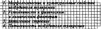 1. Для туляремии (Francisella tularensis) как одной из природно-очаговых зоонозных инфекций характерна триада биоиеноза: • возбудитель; • резервуары возбудителя; • переносчики — кровососущие насекомые. Выделяют 3 подвида туляремийного микроба: • неарктический (американский); • среднеазиатский; • голарктический (европейско-азиатский). Неарктический подвид бактерии, в отличие от остальных, характеризуется высокой патогенностью для человека и лабораторных животных. Морфология: туляремийные бактерии имеют очень мелкие размеры — 0,3—0,5 мкм, способные проходить через некоторые бактериальные фильтры. При культивировании на искусственных питательных средах микроб туляремии обычно имеет формы очень мелкого кокка, а в органах животных чаще встречается в виде коккобактерий. В культурах на питательных средах бактерии туляремии обнаруживают полиморфизм, особенно выраженный у американской разновидности. Микроб неподвижен, спор не образует, имеет небольшую капсулу. В культурах характерно образование бактериями слизи, легко обнаруживаемой при изготовле- нии мазков на стекле. Бактерии туляремии окрашиваются всеми красками, обычно применяемыми в лабораторной практике, но заметно бледнее, чем многие бактерии. По Граму туляремийные бактерии окрашиваются отрицательно. Мазки-отпечатки из органов окрашиваются по Романовскому-Гимзе, при этом туляремийные микробы отличаются от другой (посторонней) флоры более нежной фиолетовой окраской и более мелкими размерами. Биология, культуральные свойства: микроб туляремии прихотлив в отношении выращивания на искусственных питательных средах. Он не растет на обычном мясо-пептонном агаре или бульоне. Микробы удается культивировать на желтковых средах при добавлении цистина и других питательных веществ, особенно крови. Температурный оптимум 36—37°С. Строгие аэробы. Изолированные колонии удобно получать при посеве на чашки со средой Емельяновой (гидролизат рыбной муки, желатин, дрожжи, хлористый натрий, глюкоза, цистин, агар) или средой Френсиса — (мясо-пептонный агар с 1%-ным пептоном, 0,5%-ный хлористый натрий, цистин, глюкоза). После стерилизации эти среды добавляют к 5—10 мл кроличьей дефибринированной крови. Колонии на этих средах — беловатого цвета с голубоватым оттенком, круглые, с ровным краем, выпуклые, гладкие, блестящие, при разреженном посеве они достигают (через несколько дней) 1—2 мм и более в диаметре. В жидких питательных средах туляремийный микроб размножается хуже, причем рост отмечается лишь на поверхности среды, что связано с аэрофильностью бактерии. Хорошие результаты выращивания можно получить либо при добавлении к жидким средам коллоидов (куриного желтка, агара и т. д.), либо при аэрации среды. Способность сбраживать углеводы и спирты у микроба туляремии ограниченна. Туляремийные микробы ферментируют до кислоты глюкозу, мальтозу, а в ряде случаев — левулезу и маннозу. Лактозу, сахарозу, маннит и ряд других веществ туляремийные бактерии не ферментируют. 2. Устойчивость к физическим и химическим факторам: во внешней среде возбудитель сохраняется длительное время, особенно при низких температурах: в зерне и соломе при температуре ниже 0 °С до 6 мес, в замерших трупах животных — до 8 мес. В естественных условиях обнаруживали возбудители туляремии в воде ручьев, колодцев, а также в соломе