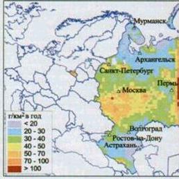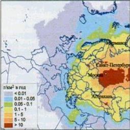 По расчетам ЕМЕП, общие выпадения бенз(а)пирена на ЕТР оценены в 18,90 т, в том числе 12,54 т (66%) составили трансграничныс выпадения, а 6,36 т (34%) - выпадения от российских источников. Существенную роль в трансграничном загрязнении ЕТР бенз(а)пиреном играют источники, расположенные на территориях Польши, Украины, Грузии, Германии и давшие почти половину трансграничных выпадений этого канцерогена. Максимальные среднесуточные концентрации бенз(а)пирена меняются от 0,3 до 3,3 нг/м3. В Калининградской, Псковской, Новгородской, Московской и Владимирской областях, в Карачаево-черкесской Республике, в Республике Северная Осетия - Алания, Республике Ингушетия, а также в Чеченской Республике среднесуточные концентрации бенз(а)пирена превышали ПДК (1 нг/м3). Выпадения полихлорированных бифенилов (ПХБ) на ЕТР варьируют в пределах 0,l…1г/km2 в год, наибольшие значения отмечены в западной и центральной частях ЕТР - Республике Карелия, Калининградской, Ленинградской, Новгородской, Псковской, Смоленской, Брянской, Вологодской, Ярославской, Ивановской, Владимирской, Тверской, Московской и Нижегородской областях. Сравнительно большие выпадения ПХБ (до 1 (г/км2/год) имеют место на территориях севера России (Мурманская область. Республика Саха (Якутия), Ненецкий, Ямало-Ненецкий, Чукотский и Таймырский (Долгано-Ненецкий) автономные округа). По предварительным оценкам, общая величина выпадений ПХБ на территории этих регионов оценена в 4,3 т, а вклад трансграничиого загрязнения в выпадения на севере России составляет 2,5 т (60%). Выпадения ПХБ на ЕТР оцениваются в 4,1 т. Среднегодовые концентрации диоксинов и фуранов (ПХДД/Ф) в приземном слое воздуха не превышают ПДК (2,12 пг ДЭ/м3). Суммарные выпадения ПХДД/Ф на ЕТР составляют 407,5 г ДЭ. Концентрации ПХДД/Ф в почве ЕТР находятся в пределах от 0,01-0,5 пг ДЭ/г с превышением уровня ПДК (0,133 пг ДЭ/г) в Калининградской, Ленинградской, Ярославской, Ивановской, Владимирской, Московской, Калужской, Брянской, Белгородской, Курской и Ростовской областях.