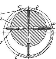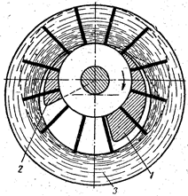 Рис 15. Схема водокольцевого компрессора. 1 — отверстие всасывания; 2 — отверстие нагнетания; 3—водяное кольцо.