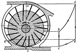 Пластинчатый компрессор (рис. 14) состоит из цилиндра, в котором эксцентрично расположен ротор с пластинами, вставленными в его пазы. В отличие от шиберного насоса, вращающиеся межпластинчатые камеры, будучи изолированными, изменяют свой объём от максимального значения до минимального, вследствие чего газ сжимается постепенно от момента отсечки камеры от всасывающего канала в точке а до момента, когда передняя пластина камеры достигнет кромки выхлопного окна b. После мгновенного выравнивания давление в камере сохраняется постоянным до тех пор, пока задняя пластина камеры не достигнет кромки с выхлопного окна. При движении камеры от с до d остаток газа расширяется.