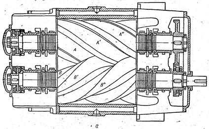 Эта передача осуществляется зубчатой парой, расположенной вне компрессора, а между лопастями сохраняется зазор, что позволяет избежать их износа и необходимости вводить в компрессор смазку. Отсутствие контакта сжимаемого газа с маслом даёт компрессору типа Руст важное преимущество. Порция газа переносится между лопастями ротора при постоянном объёме, а сжатие газа происходит в момент, когда рабочая камера сообщается с нагнетательной стороной машины. Для уменьшения шума и создания более равномерного потока газа применяют трёхлопастные винтовые роторы. Винтовые компрессоры (рис. 17) аналогичны воздуходувке типа Рутс, но отличаются от неё формой роторов и расположением окон для подвода и отвода газа в осевом направлении, как в винтовом насосе. Роторы выполнены в виде винтовой зубчатой передачи, в которой так же, как и в компрессоре типа Рутс, зубья не соприкасаются благодаря шестерням, синхронизирующим движение винтов. При вращении роторов полости А, А’, А’’ и В, В’, В’’ (рис. 17) последовательно изолируются от области всасывания, затем их объём уменьшается, так как впадины одного ротора заполняются зубьями другого. Газ, заполняющий полости, сжимается до тех пор, пока полости не сообщаются с областью нагнетания. В винтовом компрессоре так же, как и в пластинчатом, конечное давление сжатия в полости зависит не от противодавления, а от геометрии роторов и расположения нагнетательного отверстия.