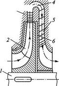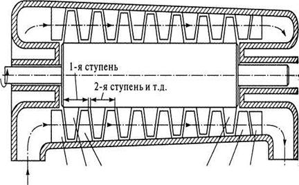 В динамических компрессорах энергия сообщается потоку газа счет того, что рабочие органы компрессора оказывают силовое воздействие на газ, находящийся в его проточной части. В промышленности используют динамические компрессоры лопастного типа, в которых рабочим органом является колесо с лопастями. Эти лопасти при вращении колеса оказывают силовое воздействие на газ. По направлению движения потока газа относительно оси вращения рабочего колеса лопастные компрессоры делятся на центробежные и осевые. Если одно рабочее колесо (одна ступень) в лопастных компрессорах не может создать требуемое давление сжатия газа, то используют последовательно несколько ступеней сжатия — многоступенчатые компрессоры, которые применяют в пневмосистемах с рабочим давлением газа до 1 МПа и выше. На рис. 22.1, а представлена схема одной ступени центробежного компрессора. Газ поступает на лопатки рабочего колеса 2, которое вместе с валом 1 вращается в корпусе 3. Приобретя энергию на рабочем колесе, газ поступает сначала в диффузор 4, где кинетическая энергия превращается в потенциальную, а затем в обратный направляющий аппарат 5, где потенциальная энергия снова переходит в кинетическую. Рабочее колесо и обратный направля ющий аппарат разделены диафрагмой 6. В многоступенчатом центробежном компрессоре ступени соединяются последовательно, как показано на рис. 22.1, б. Число ступеней определяется требуемым давлением газа на выходе компрессора с учетом того, что в обычных конструкциях в одной ступени давление повышается в 1,2... 1,5 раза.