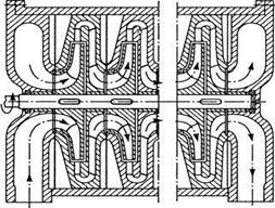 Компрессор типа Рутс (рис. 16), применяется при невысоких отношениях давлений, действует аналогично шестерённому насосу, но для увеличения объёма межзубцевых впадин число зубьев (лопастей) уменьшено до 2 – 3. В данном случае передача равномерного вращения становится затруднительной.