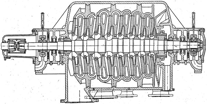 Центробежный компрессор по принципу действия и по своей конструкции сходен с центробежным насосом. В простейшем случае он состоит из рабочего колеса и нагнетательной камеры, выполненной в виде спирали (улитки). В многоступенчатом компрессоре имеются все элементы многоступенчатого насоса: лопаточные диффузоры, диафрагмы, лопатки обратного направляющего аппарата (ОНА), межступенчатые уплотнения (рис. 18). При повышении отношения давлений необходимо охлаждать газ, но водяные рубашки корпуса компрессора усложняют конструкцию. Поэтому компрессоры выполняют в отдельных корпусах с расположением промежуточных холодильников между ними. В каждом корпусе размещают последовательно несколько колёс, причём первая ступень может иметь двухсторонний привод. В отличие от насосов рабочего колеса ступеней многоступенчатых компрессоров могут быть неодинаковыми. При сжатии объём газа уменьшается, поэтому при желании сохранить в определённых границах скорости потока площади каналов рабочих колёс высших ступеней должны быть уменьшены за счёт диаметра или ширины колеса или за счёт того и другого вместе (рис. 19). Иногда во всех ступенях устанавливают одинаковые колёса, что упрощает конструкцию машины; при этом скорости и соответственно мощности в отдельных ступенях получаются неодинаковыми.