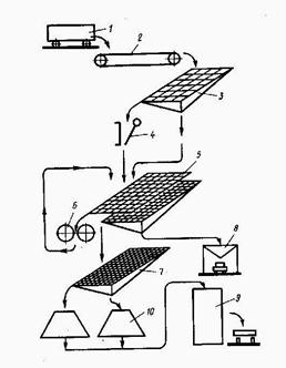 Рис. Типовая схема дробильно-сортировочной установки: 1— вагонетка; 2 — пластинчатый конвейер; 3 — колосниковый грохот; 4 — щековая дробилка; 5,7-виброгрохоты; 6 — валковая дробилка; 8 — бункер для песка и пыли; 9 — расходный бункер; 10 — склады товарного щебня
