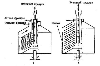 Принцип действия сепаратора-разделителя (см.рис.,а) заключается в следующем. Исходная гетерогенная система по центральной трубке поступает в тарелкодержатель, откуда по каналам, образованным отверстиями в тарелках, поднимается вверх комплекта тарелок и растекается между ними. Под действием центробежной силы легкая фракция оседает на верхнюю поверхность нижележащей тарелки. По этой поверхности легкая фракция движется к центру барабана, далее по зазору между кромкой тарелки и тарелкодержателем поднимается в верх барабана и отводится по коммуникациям. Тяжелая фракция в межтарельчатом пространстве оттесняется к нижней поверхности тарелки. По этой поверхности фракция движется к периферии тарелки и по зазору между разделительной тарелкой и крышкой барабана поднимается в верх барабана, откуда отводится по специальным коммуникациям. Сущность процесса осветления (см.рвс.,6) заключается в следующем. Продукт, подвергаемый очистке, по центральной трубке поступает в тарелкодержатель, из которого направляется в шламовое пространство между кромками пакета тарелок и крышкой. Затем жидкость поступает в межтарельчатые пространства. По зазору между тарелкодержателем и верхними кромками тарелок поднимается вверх и через прорезь выходит из барабана. Процесс очистки начинается в шламовом пространстве и завершается в межтарельчатых. Процесс разделения гетерогенных систем осуществляется главным образом в межтарельчатом пространстве. При этом траектория частиц дисперсной фазы состоит из двух стадий. Легкая фракция дисперсной фазы движется к оси вращения (рис.,а), а тяжелая — к периферии(рис.б). Саморазгружающиеся сепараторы разделяются на две основные группы: с непрерывным и пульсирующим отводом осадка. В сепараторах с непрерывным отводом осадка последний удаляется вместе с частью жидкой фазы через сопла в виде концентрированной тяжелой фракции. В сепараторах с пульсирующим отводом осадка последний выбрасывается из барабана при перемещении подвижного элемента, открывающего разгрузочные щели на периферии барабана. При полной разгрузке периодически прекращается поступление продукта на сепарирование, разгрузочные щели барабана открываются и все его содержимое, т.е. выделенный осадок и жидкая фаза, выбрасывается в приемник. Основные конструктивные факторы, которые оказывают существенное влияние на эффективность процесса сепарирования, вытекают из формул для определения производительности сепараторов. К этим факторам относятся частота вращения барабана, размеры барабана и тарелок, расстояния между тарелками.