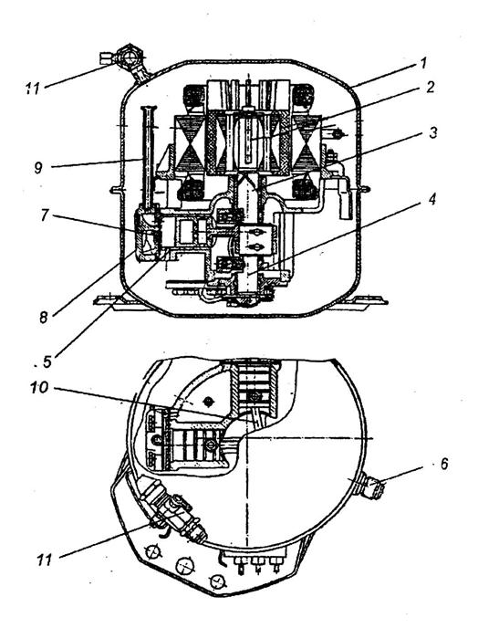 Рис. Герметичный компрессор ФГ-0,7~3: 1- штампованный корпус; 2- электродвигатель; 3- эксцентриковый вал; 4- противовесы; 5- цилиндр; 6- нагнетательный штуцер; 7- клапанная доска; 8- клапанная крышка; 9- всасывающая трубка; 10- шатун; 11- всасывающий вентиль