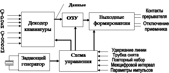 Электронные номеронабиратели бывают двух типов: кнопочный номеронабиратель с импульсным набором номера и кнопочный номеронабиратель с тональным набором номера. Электронный импульсный номеронабиратель (ИНН) должен выполнять две функции: 1. выдерживать ток в линии требуемой частоты и на определенные интервалы времени; 2. отключать приемник (телефон) для предотвращения громких щелчков, слышимых в нем во время набора номера. Устройство и работа простейшей ИС импульсного номеронабирателя. При нажатии клавиши клавиатуры включается задающий генератор, сигналом которого будет синхронизироваться схема номеронабирателя. Задающий генератор вырабатывает сигналы со стабильной частотой (3,579545 Мгц), которая определяется кварцевым резонатором. Кнопочная клавиатура вырабатывает сигнал выбора строки и выбора столбца. Логические уровни строкового и столбцового сигналов преобразуются схемой декодера в двоичный код для каждой нажатой клавиши. Эти данные заносятся в ОЗУ, так как набор номера происходит быстрее, чем ИС вырабатывает импульсы набора. Выходные формирователи (два каскада) управляют работой импульсного и разговорного ключей, или выполняют их роль и представляют собой полупроводниковые ключи на транзисторах.