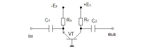 Сб – блокирующая емкость, обеспечивающая связь базы с общей шиной по переменному току. Использование базового делителя Rб1 и Rб2 позволяет обойтись одним источником питания. По постоянному току схема рассчитывается также, как соответствующая схема ОЭ.