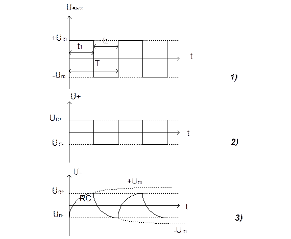 С помощью делителя R1 - R2 обеспечивается ПОС, которая переводит ОУ в триггерный режим (переключательный). R2 - R1 задают порог переключения на НИ входе. Если Uвых = +Umax, то Uпорога + = [+Umax/(R1 + R2)]* R1. Если Uвых = -Umax, то Uпорога - = [-Umax/(R1 + R2)]* R1. Пока входной сигнал на инвертирующем входе отличается от ± Uпорога, ОУ находится за счет ПОС в состоянии насыщения, либо +, либо -Umax. Когда входное напряжение сравнивается с Uпорога выходное напряжение меняет знак в зависимости от того, какой из порогов достигается, + или -. Цепочка R - C обеспечивает заряд - пере заряд емкости, подключенной к И входу за счет изменения Uвых. Таким образом, этой цепочкой обеспечивается генерация и временные соотношения в схеме. Заряд - разряд происходит с постоянной времени tзар/раз = RC