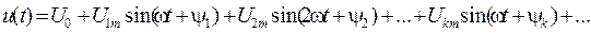 где U 0 – постоянная составляющая, равная среднему значению несинусоидального напряжения за период, U 1sin(wt+y1) – основная или первая гармоника. Она имеет тот же период T = 2p/w, что и данное несинусоидальное напряжение. Все остальные гармоники, имеющие частоту не равную частоте w, называются высшими гармониками. Номер гармоники означает во сколько раз угловая частота больше основной частоты w. Следует отметить, что число гармоник стремится к бесконечности, а амплитуды по мере увеличения номера гармоники уменьшаются и стремятся к нулю U m n ®0. Поэтому обычно можно ограничиться некоторым конечным числом ряда. Ряд Фурье (5.1) можно записать и в виде суммы синусного и косинусного рядов: