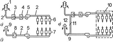 Рис. 4.5. Механическая вентиляция: а - приточная; б - вытяжная; в - приточно-вытяжная с рециркуляцией Установки приточной системы вентиляции (рис. 4.5а) состоят из воздухо-заборного устройства (1), воздуховодов (2), фильтров (3) для очистки забира-емого воздуха от примесей, калорифера (4), центробежного вентилятора (5) и приточных устройств (6) (отверстия в воздуховодах, приточные насадки и т.п.). Установки вытяжной системы вентиляции (рис. 4.5 б) состоят из вытяжных устройств (7) (отверстия в воздуховодах, вытяжные насадки), вентилятора (5), воздуховодов (2), устройства для очистки воздуха от пыли и газов (8) и устройств для выброса воздуха (9). Установки приточно-вытяжной системы вентиляции (рис. 4.5в) представ-ляют собой замкнутые системы воздухообмена. Воздух, отсасываемый из помещения (10) вытяжной вентиляцией, частично или полностью вторично подается в это помещение через приточную систему, соединенную с вытяжной системой воздуховодом (11). При изменении качественного состава воздух в замкнутой системе подается или выбрасывается с помощью клапанов (12). В производственных цехах промышленных предприятий наиболее распрос-транены общеобменные системы приточно-вытяжной вентиляции, предназна-ченные для удаления из помещений вредных паров, газов, пыли, избыточной влажности или доведения концентраций указанных вредных веществ до предельно допустимых норм. В производственные помещения могут поступать одновременно несколько вредных веществ. В этом случае воздухообмен рассчитывают по каждому из них. Если выделяющиеся вещества действуют на организм человека однонаправлено, то рассчитанные объемы воздуха суммируют. Рассчитанный объем воздуха следует подавать подогретым в рабочую зону помещения, а загрязненный воздух - удалять от мест выделения вредностей из верхней зоны помещения. Объем воздуха (м3/ч), который требуется для удаления из помещения углекислоты, определяют по формуле: