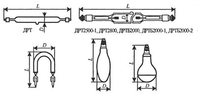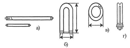 Рис.4.7. Люминесцентные лампы: а) прямые трубки; б) U – образные; в) кольцевые; г) компактные Газоразрядные лампы высокого давления Ртутные лампы высокого давления представляют собой трубку большей частью из кварцевого стекла, по концам которой впаяны активированные вольфрамовые электроды. Внутрь трубки после тщательного обезвоживания вводится строго дозированное количество ртути и спектрально чистый аргон при давлении 1,5-3 кПа. Аргон служит для облегчения зажигания разряда и защиты электродов от распыления в начальной стадии разгорания лампы, так как при комнатной температуре давление паров ртути очень низкое (около 1,5 Па). В отдельных типах ламп кварцевая разрядная трубка помещается в вакуумированную внешнюю колбу. Лампы включают в сеть с соответствующей пускорегулирующей аппаратурой. Общий вид и габаритные размеры некоторых ламп показаны на рис.4.8.