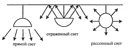 Рис. 4.9. График распределения силы Рис. 4.10. Защитный угол света в пространстве: 1 – лампа светильника: а – светильник накаливания; 2 – та же лампа с лампой накаливания; б – све- установленная в светильнике типа тильник с люминесцентными «Астра-23» лампами Важной характеристикой светильника является его коэффициент полезного действия. Осветительная арматура поглощает часть светового потока, излучаемого источником света. Отношение фактического светового потока светильника к световому потоку помещенной в него лампы называется коэф-фициентом полезного действия. По распределению светового потока в пространстве различают светиль-ники прямого, преимущественно прямого, рассеянного, отраженного и преиму-щественно отраженного света, (рис. 4.11)