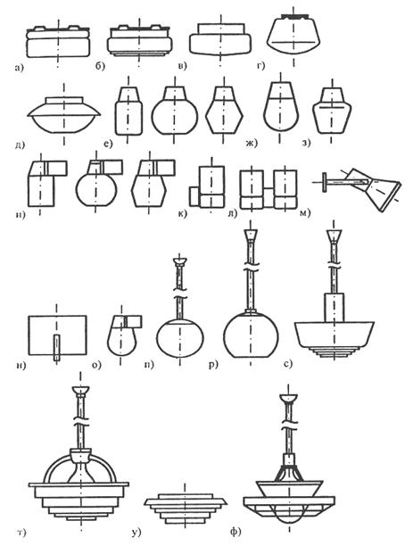 Рис. 4.13. Светильники с лампами накаливания для общественных зданий, получивших наибольшее распространение: а - НПБОО, ПЛ-11, арт. 38; б-арт.198, ПЛ-11А; в – НП091; г – ПП- 07; д – НПП07; е – НПО19;НПО20);ж - ПУН-60М; з - ПУН-100М; и – НБО05; к-НС-2; л-НСП-14; м - арт.341; н - арт. 254; о - БУН-60М; п - ПО-02; р - ПО-21; с - ПКР-2 (арт. 119); т - СК-300; у - ПЛК-150; ф - ПКР-300