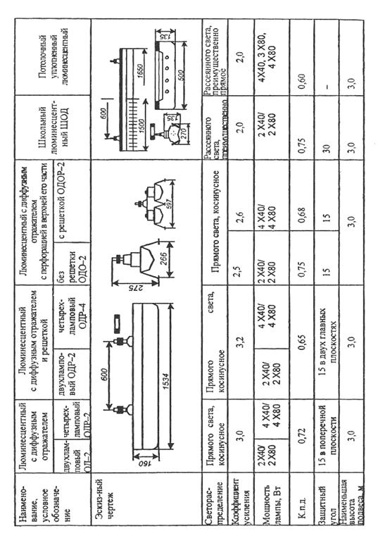 По степени защиты от пыли, воды и взрывов в соответствии с правилами устройств электроустановок (ПУЭ) различают следующие светильники: • светильники открытые - лампа не отделена от внешней среды; • защищенные - лампа отделена от внешней среды оболочкой, допускаю-щей свободный проход воздуха; • закрытые - оболочка защищает от проникновения крупной пыли; • пылезащищенные - оболочка не допускает проникновения внутрь све-тильника тонкой пыли; • влагозащищенные - корпус и патрон противостоят воздействию влаги и обеспечивают сохранность изоляции вводных проводов; • взрывозащищенные, которые делятся на взрывонепроницаемые (В) - оболочка светильника выдерживает полное давление взрыва, продукты взрыва должны выходить из светильника через щели охлажденными; повышенной надежности против взрыва (Н) - исключается возникновение искры, электрической дуги или опасных температур на поверхности светильника. Кроме того, необходимо учитывать целесообразное для рассматриваемого случая светораспределение. Основные образцы светильников с лампами накаливания и основные типы светильников внутреннего освещения (см. рис. 4.12; 4.13) а также типы светильников внутреннего освещения с люминесцентными лампами (см. рис. 4.14). Главное требование к светильникам любого назначения и исполнения - светильники должны быть рассчитаны так, чтобы при нормальной эксплуа-тации они не представляли угрозы имуществу, здоровью и жизни людей.