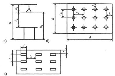 Рис. 4.15. Схема размещения светильников в помещении: а - схема размещения светильников в разрезе помещения; б, в – схема размещения светильников в плане помещения для ламп накаливания и люминесцентных ламп соответственно Эксплуатация осветительных установок. Контроль освещения Тщательный и регулярный уход за установками естественного и искусственного света имеет значение для создания рациональных условий освещения, в частности, обеспечения требуемых величин освещенности без дополнительных затрат электроэнергии. В установках с люминесцентными лампами и лампами ДРЛ необходимо следить за исправностью схем включения (не должно быть видимых глазу миганий ламп), а также пускорегулирующих аппаратов, о неисправности кото-рых, например, можно судить по значительному шуму дросселей (необходимо их исправить или заменить). Сроки чистки светильников и застекления в зависимости от запыленности помещения предусматриваются действующими нормами и должны произво-диться для стекол световых проемов (не реже двух раз в год для помещений с незначительным выделением пыли) и не реже четырех раз в год для помеще-ний со значительными выделениями пыли, для светильников - от четырех до двенадцати раз в год в зависимости от характера запыленности производ-ственного помещения. Своевременно должна производиться замена перегоревших ламп, которая осуществляется двумя способами: индивидуальным - заменяются лампы после выхода их из строя, и групповым - через определенный интервал одновременно заменяются и перегоревшие и работающие лампы (ДРЛ через 7500 ч, люминес-центные 40 Вт - через 8000 ч, люминесцентные 65-80 Вт - через 6300 ч). На крупных предприятиях (при установленной общей мощности на освещение свыше 250 кВт) следует иметь специально выделенное лицо, ведающее эксплуатацией освещения (инженер или техник). При оценке производственного освещения не реже одного раза в год после очередной чистки светильников и замены перегоревших ламп следует прове-рять уровень освещенности в контрольных точках. В настоящее время основным прибором для измерения освещенности является объективный люкс-метр (Ю-116,Ю-117), основанный на явлении фотоэлектрического эффекта. Полученная фактическая освещенность должна быть больше или равна нормируемой освещенности, умноженной на коэффициент запаса. При несоб-людении этого соотношения осветительная установка непригодна для дальней-шей эксплуатации и требует реконструкции или капитального ремонта.