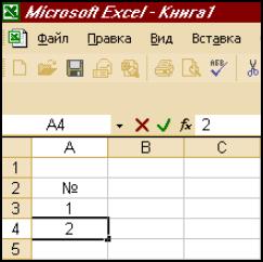 Рисунок 1 Для хранения имени столбца используется 1 байт памяти, для хранения строки 256. Ячейка – представляет наименьшую структурную единицу для размещения данных внутри рабочего листа. В качестве данных могут быть: текст, числовые значения, формулы функции и параметры форматирования. Ячейка, выбранная с помощью указателя называется активной. Тип данных вводимых в ячейку определяется системой непосредственно при вводе. При этом признаком текста является пробел, буква, апострофов, цифровых- цифра с первой позиции, признаком формул- знак равно. Блок ячеек - прямоугольная область, объединяющая отдельные ячейки, адрес блока формируется по диагональным ячейкам. Адресация ячеек. Существует 2 вида ячеек: 1) относительная (пример с В3)- при проведении копирования и перемещении, относительный адрес ячейки всегда меняется: при копировании вниз № строки увеличивается на 1, при копировании вправо имя столбца изменяется на 1 букву в сторону увеличения; 2) абсолютная- не изменяется при проведении любых манипуляций с ячейками, обозначенных $B$3, не изменится № строки, ни название столбца. Если B$2-не изменится № строки, $B2-не изменится название столбца. Формула - математическая запись вычислений, производимых над данными в таблицах. Она начинается со знака равенства или математического оператора и записанного в ячейку таблицы. Результатом выполнения формулы является вычисление значения. Пример: =$A$12+B2. Если ячейка содержащая формулу, активна, то формула проявляется в строке ввода, то есть становится видна. В противном случае в ячейки проявляется по формуле значение. Функция - математическая запись, указывающая на выполнение определенных вычислительных операций. Она состоит из имени и 1 или несколько аргументов, заключенных в круглые скобки. Пример: =SUM(A1:A10);LOGIO(B2);lg(B2) Форматирование - задание определенных параметров для внешнего представления данных, записанных в 1 или нескольких ячейках. К параметрам форматирования относится: вид и размер шрифта, рамка, цвет, выравнивание содержимого ячейки. Они задаются с помощью команд меню или кнопок панели инструментов. Его можно произвести до ввода данных в таблицы. Нельзя форматировать 1 ячейку. Стиль - представляет набор параметров форматирования, применяемых к выделенным ячейкам при указании имени стиля. Существует набор стилей, хранящихся в библиотеке стилей. Следует использовать после завершения работы с таблицей. Список - специальным образом оформленная таблица с которой можно работать как с базой данной. Плюсом является то, что возможно манипулировать данными.