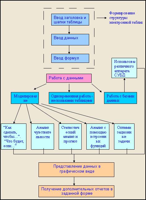 Существует обобщенная технология работы с электронными таблицами. Она включает 4 этапа: • Формирование структуры таблицы. Она включает определение заголовка таблицы, название строк и столбцов, а так же ввод в ячейки таблицы исходных данных, формул и функций. • Работа с данными. • Исследование сформировавшейся таблицы. Такое исследование может быть связано с использованием определенных математических формул, моделей, методов одновременной работы с несколькими таблицами и методом работы с базой данных. • Математические модели помогают на основе имеющихся таблицы, получить новую информацию, решением типовых задач компьютерного моделирования. Они звучат так: «что будет если…?», обратная задача: «как сделать чтобы…?». Решение таких задач дает возможность пользователю узнать как изменятся входные параметры при изменении 1 или нескольких величин. Расширением таких задач являются задачи анализа чувствительности, позволяющие определить как изменяется решение модели при изменении входных величин, заданным шагом в определенном диапазоне значений. Задача компьютерной модели «как сделать чтобы…?» возникает в случае если цель достижения определенного значения модели, пользователь ищет значение входных параметров, обеспечивающих достижение этой цели. Различные виды анализа данных, содержащихся в исходной таблице можно проводить с использованием функций и процедур. Пример: входящие в состав электронной таблицы статистические функции могут быть использованы в статистическом анализе или для прогноза, содержащихся в таблице данных. Использование финансовых функций позволяет произвести анализ эффективности, планируемых капиталовложений, рассчитать стоимость ценных бумаг. Для решения оптимизационных задач используются специальные модели математического программирования. Пример: если рекламная фирма имеет центральный офис и несколько филиалов, то появляется задача объединения документов и отчетов, приходящих из этих филиалов. Решение подобной задачи требует использования специальных многотабличных связей и программных методов для манипулирования с данными и генерации отчетных форм. Одновременная работа с несколькими таблицами - это одна из возможностей работы с данными в электронной таблицы. Если при работе с большими электронными таблицами требуется найти ту или иную строку (столбец) или отсортировать строки (столбцы) в нужном порядке, то следует использовать инструментарий СУБД, в этом случае электронная таблица интерпретируется как база данных. Представление результатов 1 или 2 этапов в графическом виде, позволяющих наиболее ярко их интерпретировать. Обеспечивает вывод результирующих данных на печать. При этом данные могут быть выведены как в табличной форме, так и форме графической диаграммы. Схематично обобщенная технология.