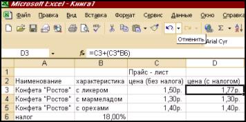 Рисунок 7 Особенностью использования относительной адресации является тот факт, что формулу вычисления стоимости пользователь вводит в соответственную ячейку лишь 1 раз, а затем после успешного выполнения копирует по столбцу вниз. • Абсолютная адресация ячеек.