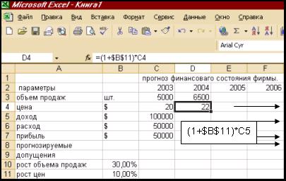 Рисунок12 Расходы и продажные цены определяются с учетом заданного роста цен, а объем продаж с учетом объема продаж. При изменении прогнозируемых допущений электронная таблица должна немедленно пересчитывать значения всех прогнозируемых финансовых характеристик. Разработанную электронную таблицу следует защитить от внесения несанкционированных изменений, кроме ячеек, содержащих значение, прогнозируемых допущений.