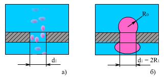 Всплывающий пузырь пара подвержен воздействию силы внутреннего давления, стремящегося разорвать жидкую пленку вокруг пузыря, и силы поверхностного натяжения этой пленки. В начальный момент выхода пузыря из объема жидкости (рис.9.58в) вода с пленки стекает, пленка утоняется и разрывается (рис.9.58г). Пар выходит через образовавшееся отверстие, разрушает верхнюю часть пленки и превращает ее в мелкие капли воды. Остатки жидкой пленки опускаются вниз, заполняют образовавшуюся после выхода пара лунку в воде. Соударение движущихся потоков воды в центре лунки приводит к выбросу крупных капель воды в паровой объем (рис. 9.58д). На каплю воды диаметром dК в паровом пространстве действуют две силы: сила Архимеда (направленная вниз)