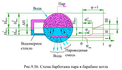 При дальнейшем увеличении расхода пара (при скорости пара wМАКС) отдельные струи пара могут сливаться вблизи дырчатого листа, образуя над ним сплошной паровой слой, отделяющий дырчатый лист от вышележащей жидкости. Это явление называется кризисом барботажа. После выхода из отверстий дырчатого листа пар барботирует через слой жидкости. Слой пароводяной смеси, в котором происходит барботаж пара, называется динамическим двухфазным слоем. На рис.9.56 показано изменение истинного паросодержания по высоте барабана. На выходе из пароотводящих труб истинное паросодержание равно паросодержанию пароводяной смеси φПВС после испарительной поверхности, затем из - за смешания с водой в барабане уменьшается. В паровой подушке φПОД = 1. На выходе из отверстий дырчатого листа паросодержание равно относительной площади сечения отверстий φДЛ.