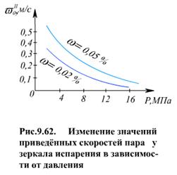 Коэффициент С зависит от давления и характеризует физические свойства пара и жидкости (рис.9.61). С увеличением давления коэффициент поверхностного натяжения s снижается, соответственно уменьшается размер капель воды, скорость витания падает, а количество капель увеличивается. Кроме того, увеличивается несущая способность пара за счет роста его плотности. Поэтому при изменении давления от 10 до 16 МПа коэффициент С и влажность пара о изменяются в 5 раз. Отсюда вытекает необходимость снижения приведенной скорости пара у зеркала испарения (нагрузки зеркала испарения) при проектировании парового котла на более высокое давление (рис.9.62), что вызывает увеличение размеров барабана. Второй путь снижения влажности пара - использование сепарационных установок внутри барабана.