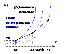 где y 0 = u 0, а все y k – приближенные значения искомой функции (см. рисунок). В методе Эйлера происходит движение не по интегральной кривой, а по касательной к ней. На каждом шаге касательная находится уже для новой интегральной кривой (что и дало название методу – метод ломаных), таким образом ошибка будет возрастать с отдалением x от x 0. При Метод Эйлера легко обобщается для систем ОДУ. При этом общая схема процесса (5) может быть записана так: