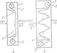 Рис. 37. Рулонные фильтры обычного типа (а) и компактные (б): 1 – каркас фильтра; 2 – подающий барабан; 3 – приемный барабан; 4 – фильтрующая ткань; 5 – направляющие ролики.