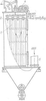 Рис. 38. Рукавный фильтр: 1 – тканевые рукава; 2 – корпус фильтра; 3 – патрубок для выхода очищенного воздуха; 4 – устройство для регенерации рукавов; 5 – патрубок для ввода загрязненного воздуха.