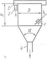 Рис. 53. Схема открытого гидроциклона: 1 – входной патрубок; 2 – кольцевой водослив; 3 – труба для отвода очищенной воды; 4 – шламоотводящая труба.