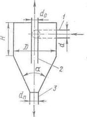 Рис. 54. Схема напорного гидроциклона: 1 – входной патрубок; 2 – труба для отвода воды; 3 – труба для отвода шлама.