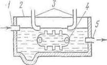 Рис. 55. Схема маслоловушки: 1 – входной патрубок; 2 – отстойная камера; 3 – маслосборник; 4 – цепной конвейер; 5 – выходной патрубок.