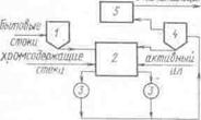 Рис. 57. Схема установки биохимической очистки хромсодержащих сточных вод: 1 – отстойник бытовых вод; 2 – смеситель; 3 – биовосстановители; 4 – отстойник; 5 – резервуар.