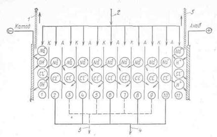 Рис. 59. Схема процесса электродиализа: А – анионитовые мембраны; К – катионитовые мембраны; 1 – выход газообразного водорода; 2 – подача сточной воды; 3 – выход газообразных хлора и кислорода; 4 – выпуск обессоленной воды; 5 – выпуск рассола