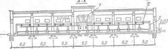 Рис. 63. Капельный биофильтр: 1 – дозирующие баки сточной воды; 2 – спринклеры; 3 – железобетонная стенка; 4 – загрузка биофильтра; 5 – подача сточной воды; 6 – отводящий лоток.