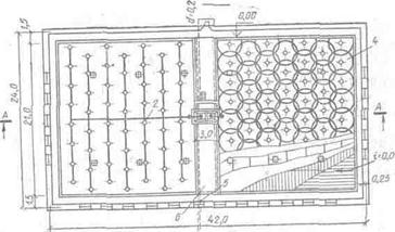 Почва – это сложный комплекс органических и неорганических веществ, заселенный большим числом различных микроорганизмов. В почве отсутствуют благоприятные условия для развития патогенной микрофлоры, паразитирующей в организме человека, вследствие чего почва представляет собой надежный и мощных фактор обезвреживания сточных вод. В результате почвенной очистки одновременно решаются две основные задачи – минерализация внесенных органических веществ и обеззараживание. Сооружения почвенной очистки сточных вод по мощности разделяют на малые (с расчетной пропускной способностью 0,5-700 м3/сут), средние (1400-80000 м3/сут) и крупные (100000-280000 м3/сут). К таким сооружениям относятся площадки подземной фильтрации, фильтрующие колодцы, песчано-гравийные фильтры, фильтрующие траншеи с естественным или искусственным слоем грунта, а также коммунальные поля орошения, земледельческие поля орошения и поля наземной фильтрации. Применяют несколько видов систем орошения: сплошной залив, залив по бороздам и полосам, дождевание и подпочвенное орошение. Считают, что из всех способов орошения подпочвенное наиболее удовлетворяет эпидемиологическим, санитарно-техническим, агроэкономическим, эстетическим и водохозяйственным требованиям. К сожалению, орошение сточными водами не позволяет достаточно эффективно очищать их от органических веществ и не исключает возможность загрязнения почвы и выращиваемых культур патогенными бактериями и яйцами гельминтов. В связи с этим почвенная очистка по масштабам применимости значительно уступает методам естественной очистки в искусственных сооружениях и методам искусственной биологической очистки. Биологические пруды – искусственно созданные водоемы, в которых для очистки сточных вод используются естественные процессы. Эти пруды могут применяться как для очистки, так и для глубокой очистки сточных вод, прошедших биологическую очистку. Это последнее назначение биологических прудов имеет преимущественное распространение. Различают пруды с естественной и искусственной аэрацией. Аэрация способствует улучшению деятельности микрофлоры, а также прямому окислению органики за счет кислорода воздуха. Конструкция биологического пруда с искусственной аэрацией для очистки и доочистки сточных вод пропускной способностью 1400 м3/сут приведена на рис. 61.