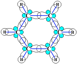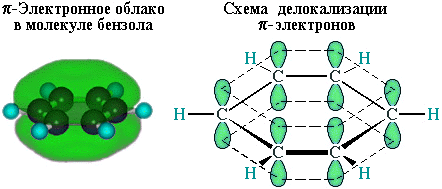р-Электроны всех атомов углерода взаимодействуют между собой путем бокового перекрывания соседних 2р-АО, расположенных перпендикулярно плоскости σ-скелета бензольного кольца. Они образуют единое циклическое π-электронное облако, сосредоточенное над и под плоскостью кольца.