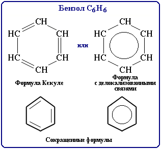 Все связи С–С в бензоле равноценны, их длина равна 0,140 нм, что соответствует промежуточному значению между длиной простой связи (0,154 нм) и двойной (0,134 нм). Это означает, что в молекуле бензола между углеродными атомами нет чисто простых и двойных связей (как в формуле, предложенной в 1865 г. немецким химиком Ф.Кекуле), а все они выровнены. Поэтому структурную формулу бензола изображают в виде правильного шестиугольника (σ-скелет) и кружка внутри него, обозначающего делокализованные π-связи: