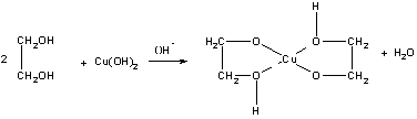 Для двух- и трехатомных спиртов характерны основные реакции одноатомных спиртов. В реакциях могут участвовать одна или две гидроксильные группы. Взаимное влияние гидроксильных групп проявляется в том, что многоатомные спирты — более сильные кислоты, чем одноатомныеспирты. Поэтому многоатомные спирты, в отличие от одноатомных, реагируют со щелочами, образуя соли. По аналогии с алкоголятями соли двухатомных спиртов называют гликолятами, а трехатомных — глицератами. Качественной реакцией на многоатомные спирты, содержащие группы ОН при соседних атомах углерода, является ярко, синее окрашивание при действии свежеосажденного гидроксида меди (II). Цвет раствора обусловлен образованием комплексного гликолята меди: