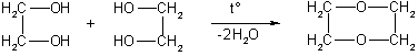 1. Гидролиз алкилгалогенидов (аналогично одноатомным спиртам): ClCH2-CH2Cl + 2NaOH → НОСН2-СН2ОН + 2NaCl. 2. Этиленгликоль образуется при окислении этилена водным раствором перманганата калия: СН2=СН2 + [О] + Н2О → НOСН2-СН2ОН. 3. Глицерин получают гидролизом жиров. Применение. Этиленгликоль применяют для синтеза полимерных материалов и в качестве антифриза. В больших количествах он используется также для получения диоксана, важного (хотя и токсичного) лабораторного растворителя. Диоксан получают межмолекулярной дегидратацией этиленгликоля: