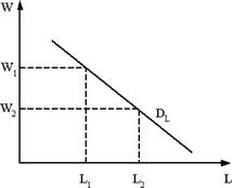 В отличие от спроса на продукты конечного потребления, спрос на факторы производства имеет свою специфику: он имеет производный, вторичный характер. Производный характер объясняется тем, что потребность в факторах производства возникает лишь в том случае, если с их помощью могут быть произведены пользующиеся спросом конечные потребительские блага. Спрос на любой фактор производства находится в прямой взаимосвязи со спросом на потребительские товары, изготовленные с помощью данного фактора производства. В то же время существует обратная зависимость между спросом на ресурс и его ценой, это является следствием уменьшения предельного продукта ресурса в денежном выражении. В связи с тем, что все факторы производства, с одной стороны, являются взаимозаменяемыми, а с другой – взаимодополняемыми, спрос на факторы производства – это взаимозависимый процесс, где объем каждого привлекаемого в производство ресурса зависит от уровня цен не только на каждый из них, но и на все остальные, сопряженные с ними ресурсы и факторы. Рынок труда – это сфера взаимоотношений покупателей и продавцов трудовых услуг. Как и любой рынок ресурсов, он формируется за счет взаимодействия спроса и предложения. Рынок труда имеет свои особенности. Спрос на труд считается вторичным, производным от первичного спроса на готовые продукты и особенно на потребительские товары. Основным фактором, формирующим спрос на труд, является потребность производства в людских ресурсах. Закон спроса на труд: чем меньше заработная плата (w), тем больше величина спроса на труд (рис. 18.1).