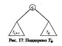 где depth (¼) – глубина соответствующего узла дерева. Теперь, если есть дерево двоичного поиска Т, обладающее наименьшей стоимостью, можно выполнить последовательность операций ПРИНАДЛЕЖАТЬ с наименьшим средним числом посещений узлов, просто применив для выполнения каждой операции ПРИНАДЛЕЖАТЬ алгоритм 14 на T. Если даны числа p i и q i, то как найти дерево наименьшей стоимости? Подход "разделяй и властвуй" предлагает определить элемент a i, который надо поставить в корень. Это разбило бы данную задачу на две подзадачи: построение левого и правого поддеревьев. Однако, похоже, нет легкого пути определения корня без решения всей задачи. Поэтому придется решать 2п подзадач: по две для каждого возможного корня. Это естественно приводит к решению с помощью динамического программирования. Для 0 £ i < j £ n обозначим через Т ij дерево наименьшей стоимости для подмножества { a i+1, a i+2, ¼, a j}. Пусть c ij – стоимость дерева Т ij, а r ij – его корень. Вес w ij дерева Т ij определяется как q i + (p i+1 + q i+1)+ ¼ +(p j + q j). Дерево T ij состоит из корня a k, левого поддерева Т i,k–1 (т. е. дерева наименьшей стоимости для { a i+1, a i+2, ¼, a k–1}) и правого Т kj (т. е. дерева наименьшей стоимости для { a k+1, a k+2, ¼, a j}) (рис. 17). Если i=k–1, то нет левого поддерева, а при k=j нет правого поддерева. Для удобства Т ii будет трактоваться как пустое дерево. Вес w ii дерева Т ii равен q i, а его стоимость c ii равна 0.