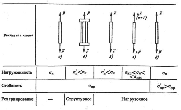 Резервирование. Метод повышения надежности автомобильной техники введением избыточности: структурной, нагрузочной или функциональной — называется резервированием. Структурное резервирование предусматривает создание избыточных элементов в структуре изделия; нагрузочное — способность изделия воспринимать дополнительные нагрузки. Например, стержень растягивается силой F (табл. 10,. вариант а). Отказ — разрушение стержня. Его надежность оценивается вероятностью неразрушения, определяемой соотношением напряжения σн от внешней нагрузки и напряжения σпр определяемго стойкостью металла от разрушения. для увеличения надёжности можно включить второй стержень параллельно первому (вариант б). Возникает структурное резервирование. Поскольку Второй стержень избыточен в структуре, тот же результат можно получить и другими способами, сохранив один стержень: увеличив его площадь вдвое (вариант в), уменьшив нагрузку так, чтоб k= 0,5 (вариант г), повысив прочность материала стержня до σ'пр = 2 σпр (вариант д). Варианты б, г и д относятся к нагрузочному резервированию: по рабочему напряжению (вариант в), по нагрузке (вариант г), по предельному напряжению (вариант д). Функциональное резервирование предполагает использование способности элементов выполнять дополнительные функции. Например, основное назначение стояночного тормоза—удержание автомобиля неподвижным, но, кроме того, он может использоваться и при движении. В целом, функциональное резервирование имеет в автомобилях ограниченное применение. Структурное резервирование различается по режиму работы и способам включения, целям, последствиям отказа основного элемента. Структурное резервирование предполагает обычно параллельное включение резервных элементов основным. Резервные элементы могут быть нагруженн (постоянно включенными), ненагруженными, работающими в облегченном режиме, со смешанным включением Таблица10. Примеры структурного и нагрузочного резервирования