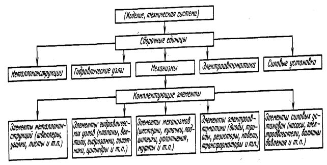 Рис. 1 Иерархическая схема изделия Следует отметить, что изготовление основных узлов и изделия проводят по документации главного конструктора на стендовом оборудовании в условиях предприятия-изготовителя опытных образцов. В ходе испытаний по мере появления неисправностей их анализируют и принимают конструктивные меры по совершенствованию основных узлов и комплектующих элементов изделия. Проводимые конструктивные изменения вводят в техническую документацию опытных образцов изделия. После завершения стендовых испытаний комплектующих элементов и узлов их монтируют на изделие, а затем приступают к предварительным испытаниям на проверку работоспособности. В процессе предварительных испытаний на функционирование выявляются замечания и неисправности, на основании которых корректируют конструкторскую и эксплуатационную документации.