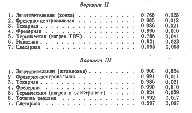 Из них надо было отобрать один, обеспечивающий наибольшую технологическую надежность для этого в каждом варианте прослеживалась и количест- венно оценивалась вероятность R соответствия фактических параметров вала требуемым, по измерениям партии из 50 валов. Например, по первому маршру- ту оценивались выборки по операциям токарным, термической обработки, шлифовальным с одинаковой продолжительностью наблюдений (20 ч). В качестве основных оценочных параметров принимались вероятность R и интенсивность λ нарушений технологического процесса, представляющая собой вероятность появления нарушения, отнесенную к достаточно малому промежутку времени. таким образом, вероятность R характеризовала безотказность технологическога процесса, а λ — интенсивность его изменения во времени. Результаты наблюдений за каждой операцией позволяют оценить в первом приближении рассматриваемые варианты параметрами R = ПiRi ; λ=Σiλi (i – число операций в варианте)
